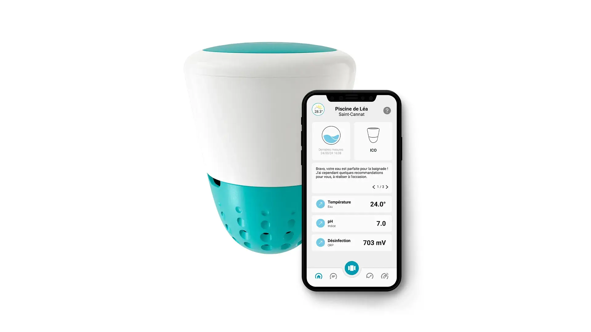 L'analyseur d'eau connecté ICO Spa d'Ondilo se réinvente avec sa toute nouvelle version V2: cette nouvelle génération ICO améliore la fiabilité de ses mesures grâce à un renforcement du contrôle des capteurs. Elle se voit dotée d'une nouvelle plateforme électronique et d'un système de gestion de la batterie encore plus performants et résistants aux agressions externes. L'ICO Spa V2 est compatible avec les traitements au chlore et au brome, et électrolyseur au sel (409€) Connecté à votre réseau Wi-Fi, l'ICO Spa V2 analyse en toute autonomie la qualité de l’eau de votre spa toutes les heures, et formule des recommandations personnalisées de traitements chimiques avec le bon produit au bon dosage sur l’application mobile ICO. Vous retrouvez ensuite toutes ces données en temps réel en accédant directement au tableau de bord - lui aussi remanié - sur l'application ICO. La nouvelle présentation du tableau de bord de l'ICO Spa V2 intègre désormais le Water Index, qui offre une vue simplifiée de l’équilibre et de la qualité de l’eau grâce à son code couleurs. En prime, les tendances d’évolution et des graphiques avec des vues détaillées selon la période souhaitée. Comment ça marche ? Il suffit de télécharger l'application gratuite disponible sur Google Play ou App Store, de connecter l'ICO Spa V2 (n'oubliez pas de conserver le QR Code collé sur le couvercle de la boîte!), et de le placer sur l'eau ou dans le skimmer, et même sous la couverture du spa grâce à sa ligne de flottaison basse. L'ICO Spa V2 se recharge en début de saison via un chargeur USB, pour se faire ensuite totalement oublier. Sa batterie a une autonomie de 12 mois ! Caractéristiques d'ICO Spa V2 Dimensions : 150 x 110 mm Poids : 700g En plastique ASA robuste traité anti-UV, résistant au chlore Capteurs amovibles : protégés par une coque rigide, conçus pour résister plusieurs années. Etanchéité : IP68 Compatibilité de traitement L'ICO Spa V2 est compatible avec les spas traités au chlore et au brome, et avec électrolyseur de sel. La version chlore/brome contient 2 capteurs amovibles pH et ORP/Redox en platine (désinfection). La version sel contient 3 capteurs amovibles pH, ORP/Redox (sonde or) et Conductivité (sel/TDS) qui détecte quand l'ICO est hors de l'eau.
