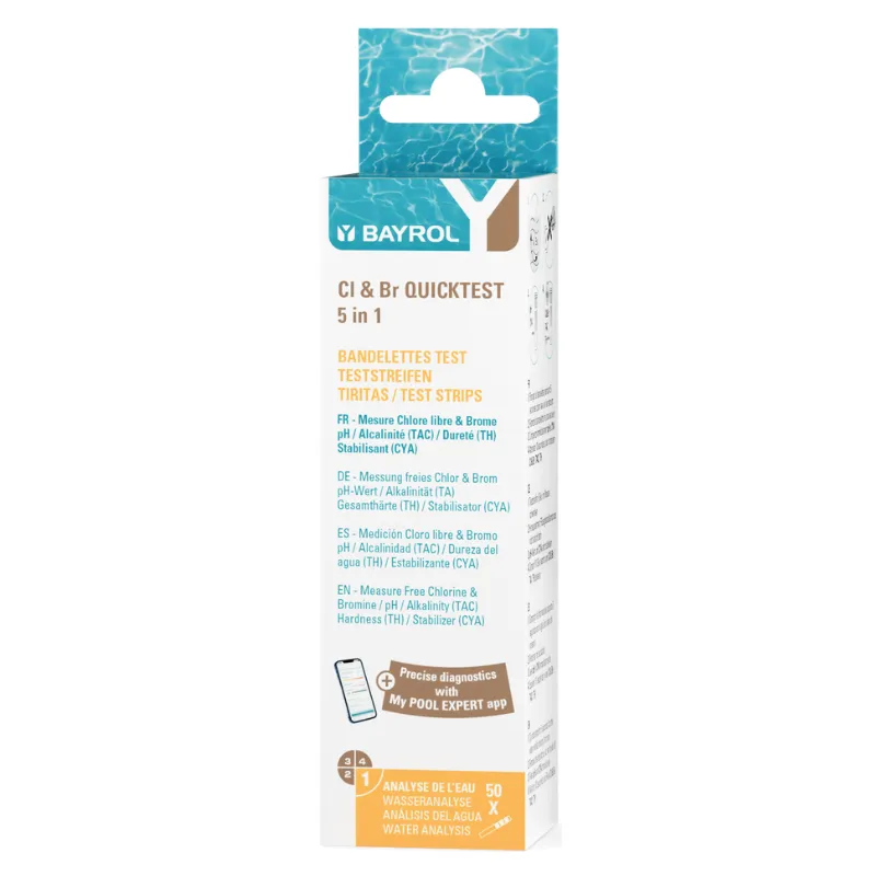 Bandelettes test piscine pour mesurer le Chlore libre & Brome, pH, Alcalinité (TAC), Durété totale (TH) et Stabilisant (CYA). 5 paramètres clés analysés en un seul geste