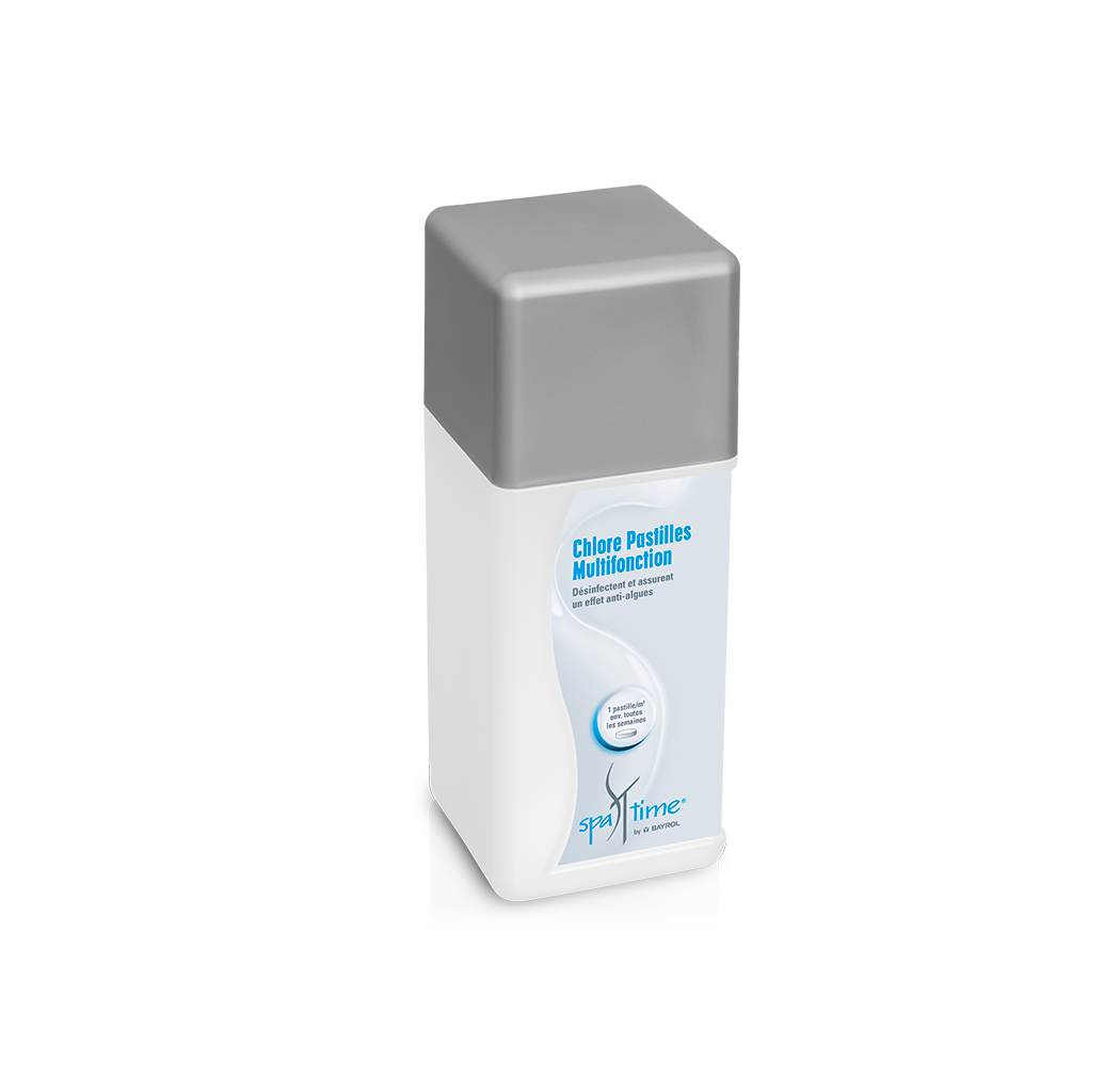 Pastille de chlore multifonction désinfecter le spa. Les pastilles de chlore multifonction de Bayrol Spa time sont une solution désinfectante efficace pour éliminer les bactéries et autres germes nuisibles dans l'eau de votre spa. Ces pastilles de chlore à dissolution lente de grande qualité se dissolvent intégralement et sans résidus pour une désinfection efficace sans influencer le pH de l'eau du spa. Le chlore stabilisé dans les pastilles permet une efficacité prolongé même avec une température haute. Quel est le dosage recommandé pour le traitement au chlore Spatime de Bayrol ? Contrôler au moins une fois par semaine la valeur de chlore à l'aide des Bandelettes 5 analyses SpaTime et l'ajuster si nécessaire (valeur idéale : 1,0 – 1,5 mg/L). Le dosage dépend de la quantité de chlore mesurée. S'assurer régulièrement que l'eau contient du chlore, afin de prévenir d'éventuels problèmes lors du traitement de l'eau. Mettre les pastilles dans la cartouche de filtration, ou dans le compartiment de votre spa prévu à cet effet. Dosage : ajouter une pastille de chlore multifonction par m3 environ toutes les 2 semaines.