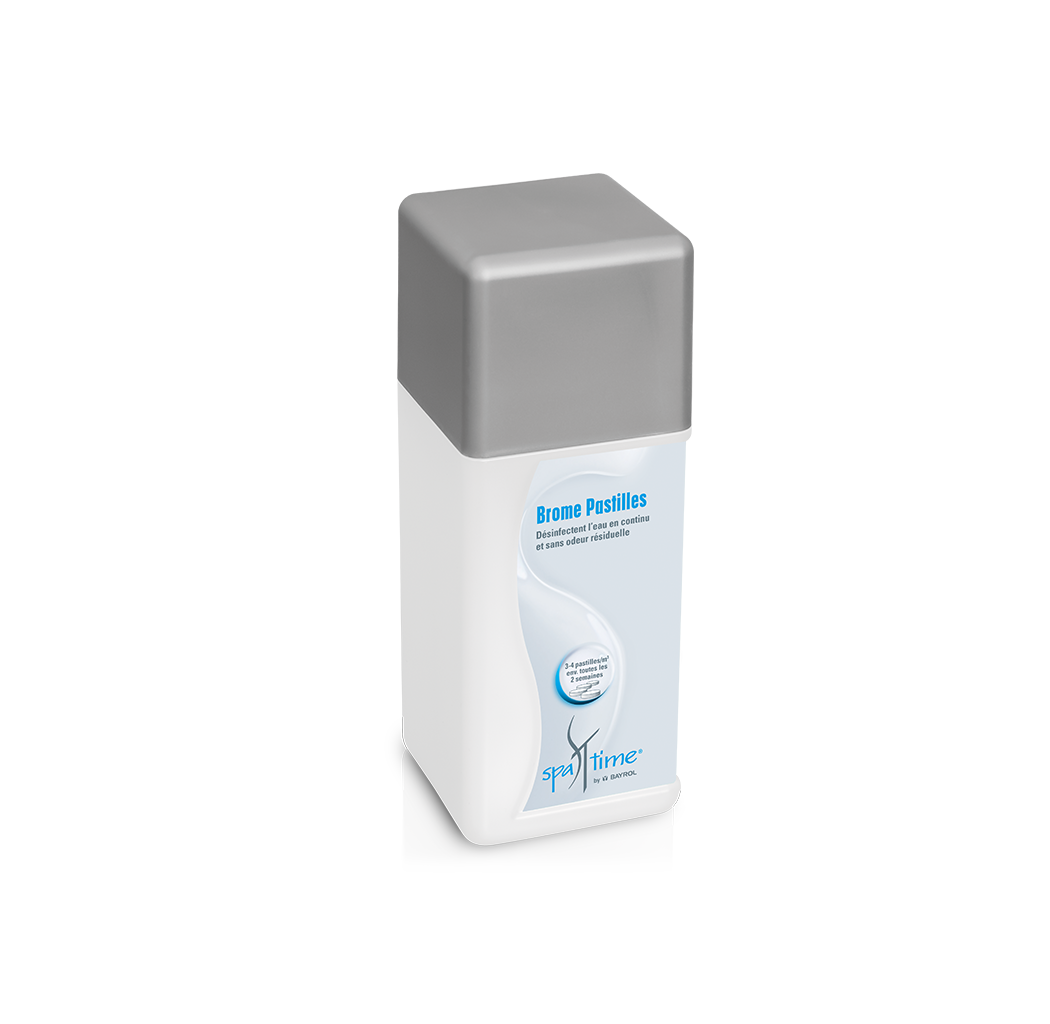 Pastilles de brome spécial spa à dissolution lente pour une désinfection continue de l'eau.Utilisez ce produit en vous conformant exclusivement au mode d’emploi.