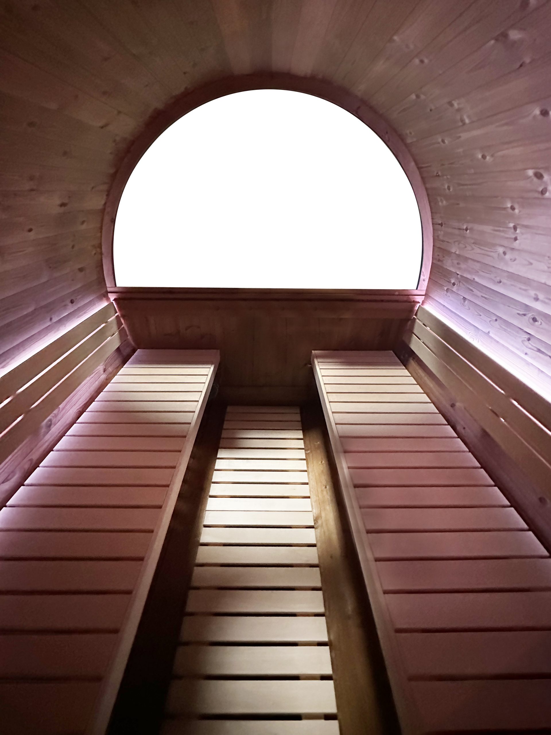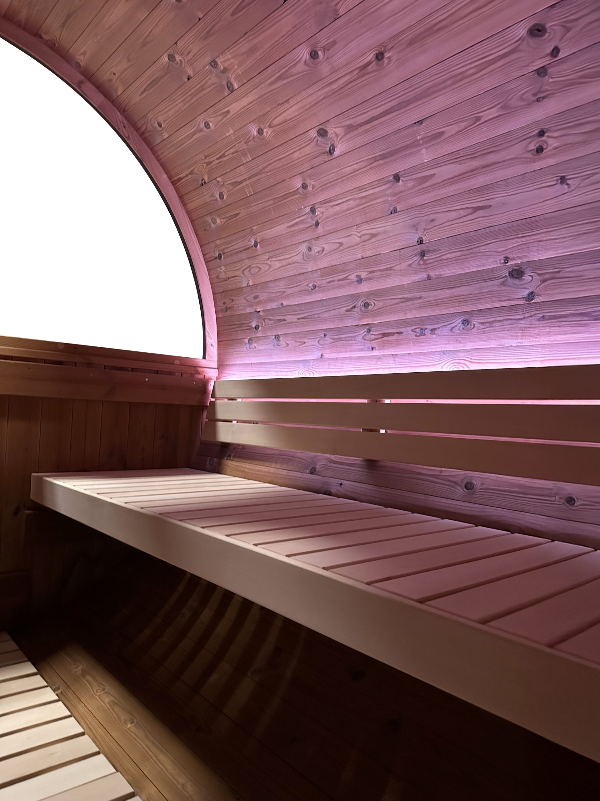 • Intérieur avec double banquette en pin brut + ruban LED blanc intégré pour ambiance relaxante