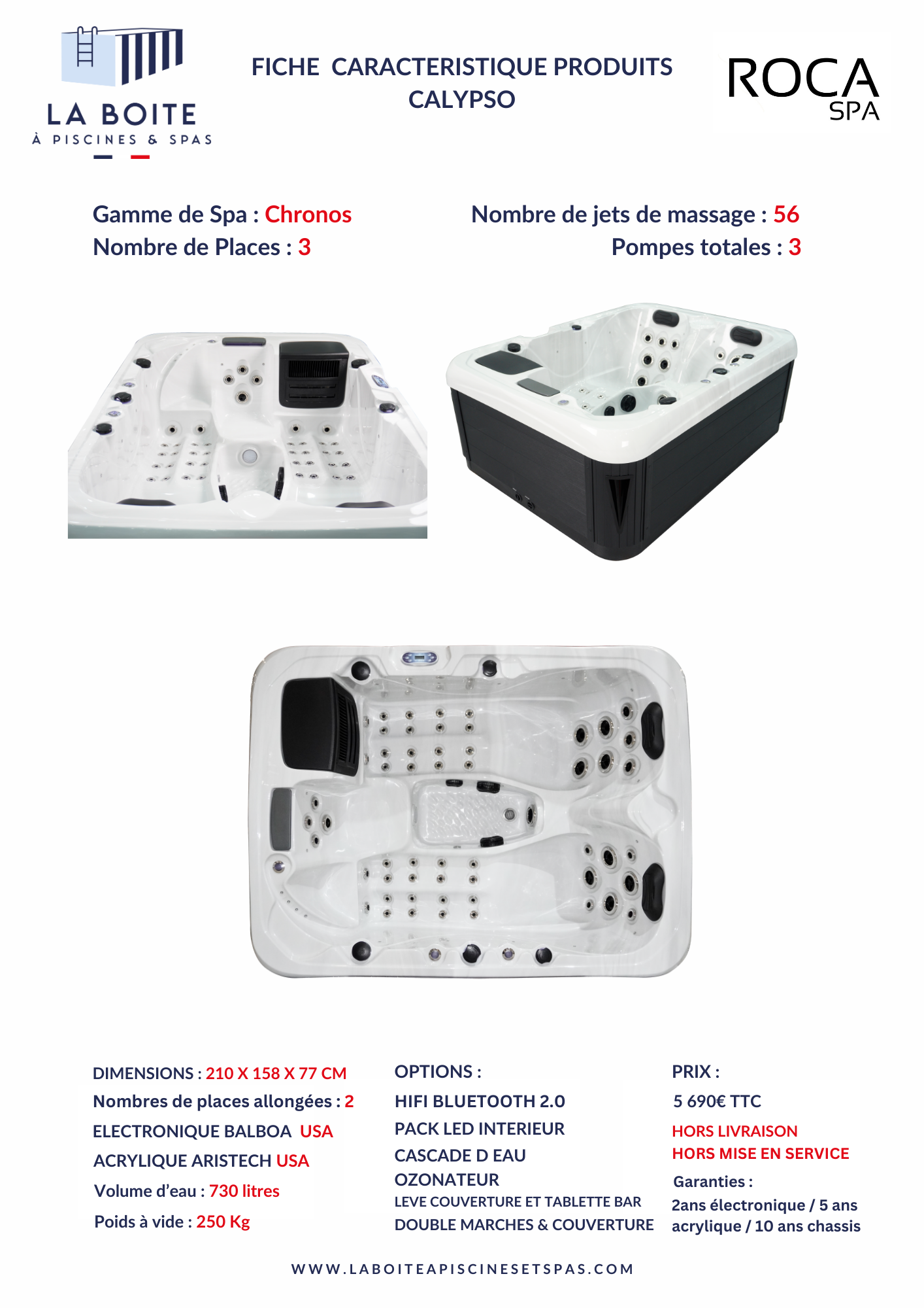 Le modèle CALYPSO offre une combinaison parfaite de relaxation et de praticité. Avec ses 2 positions allongées et 1 assise, ce spa compact est idéal pour des moments de détente à partager. Grâce à sa hauteur de seulement 77 cm, il peut facilement passer par la plupart des portes, ce qui le rend parfait pour une installation en intérieur comme en extérieur.
